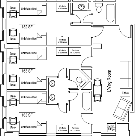 - Three-Bedroom Suite (2 double-occupancy bedrooms, 1 triple-occupancy bedroom, 2 bathrooms): 3 units
