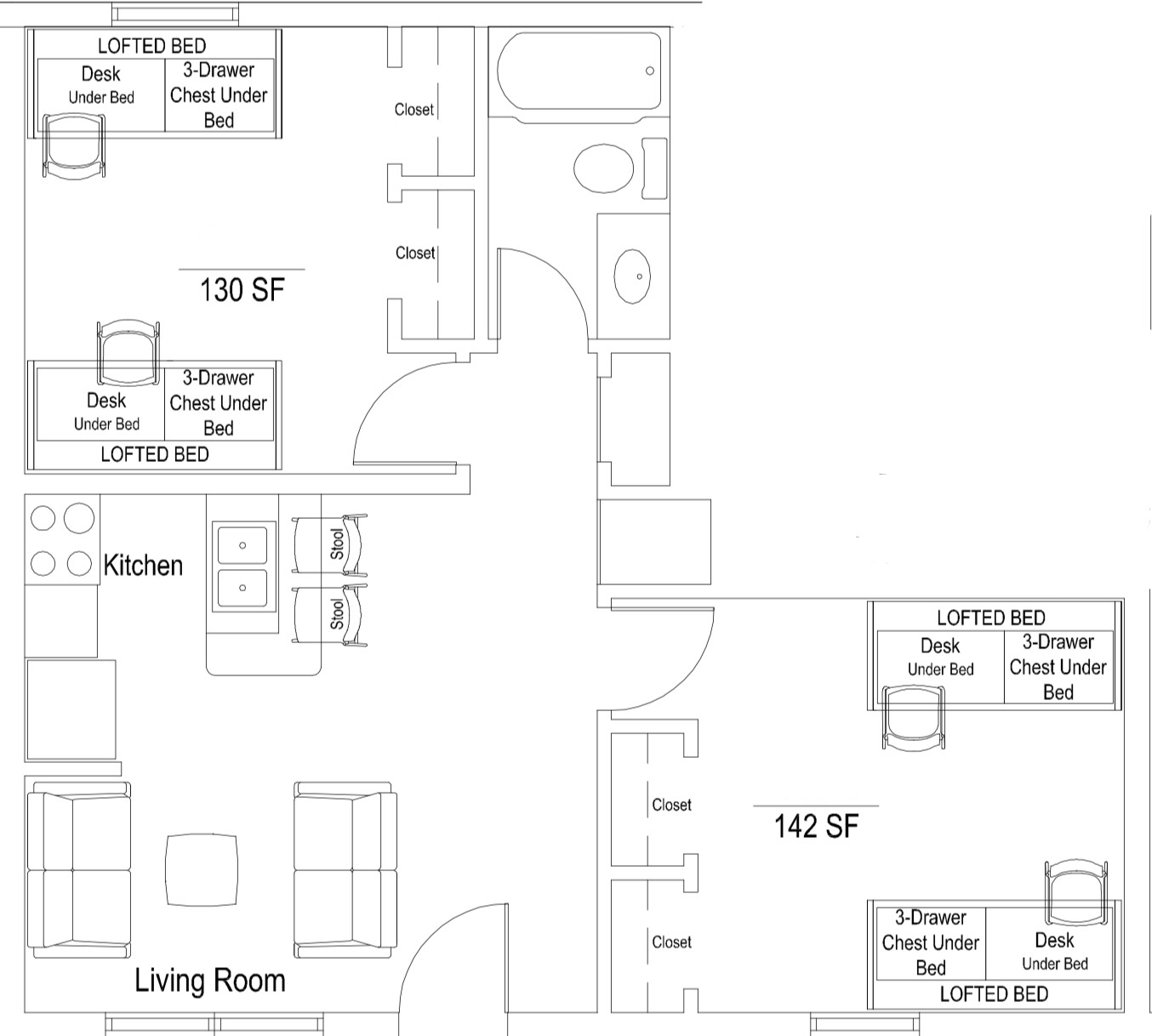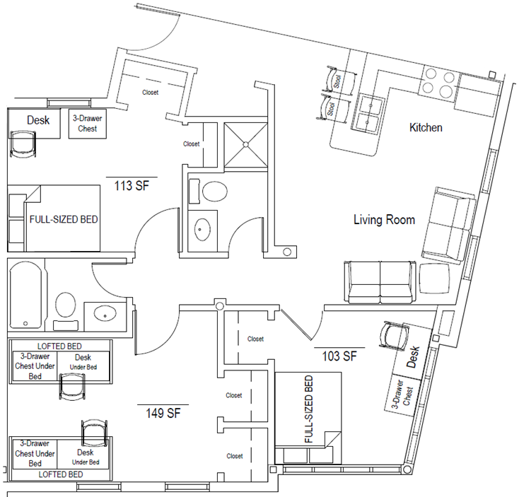 - Four-bedroom apartment (1 double-occupancy bedroom, 3 private bedrooms, 2 bathrooms): 3 units