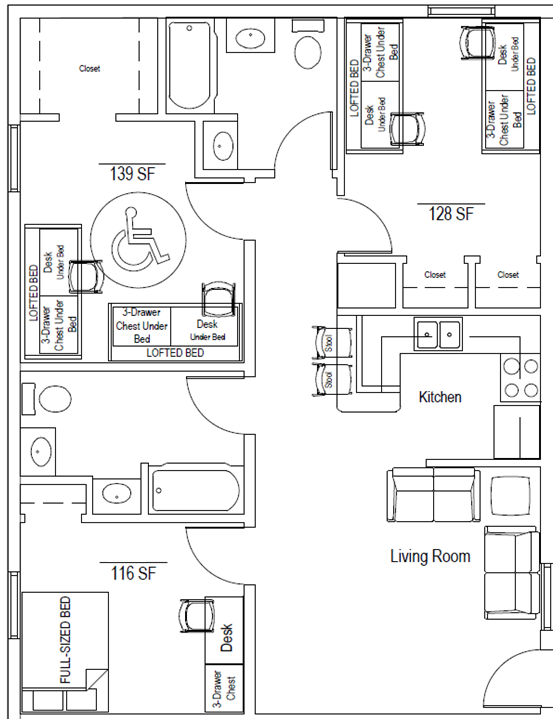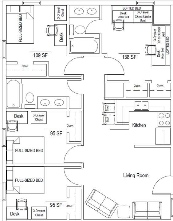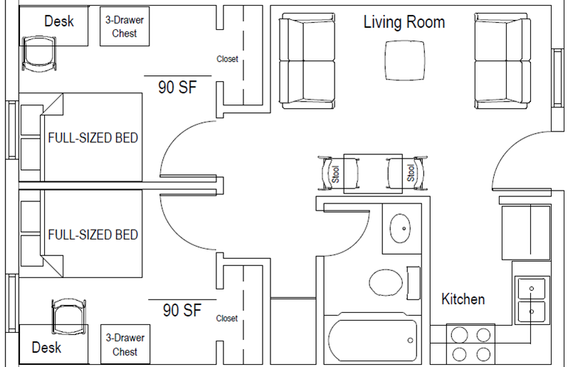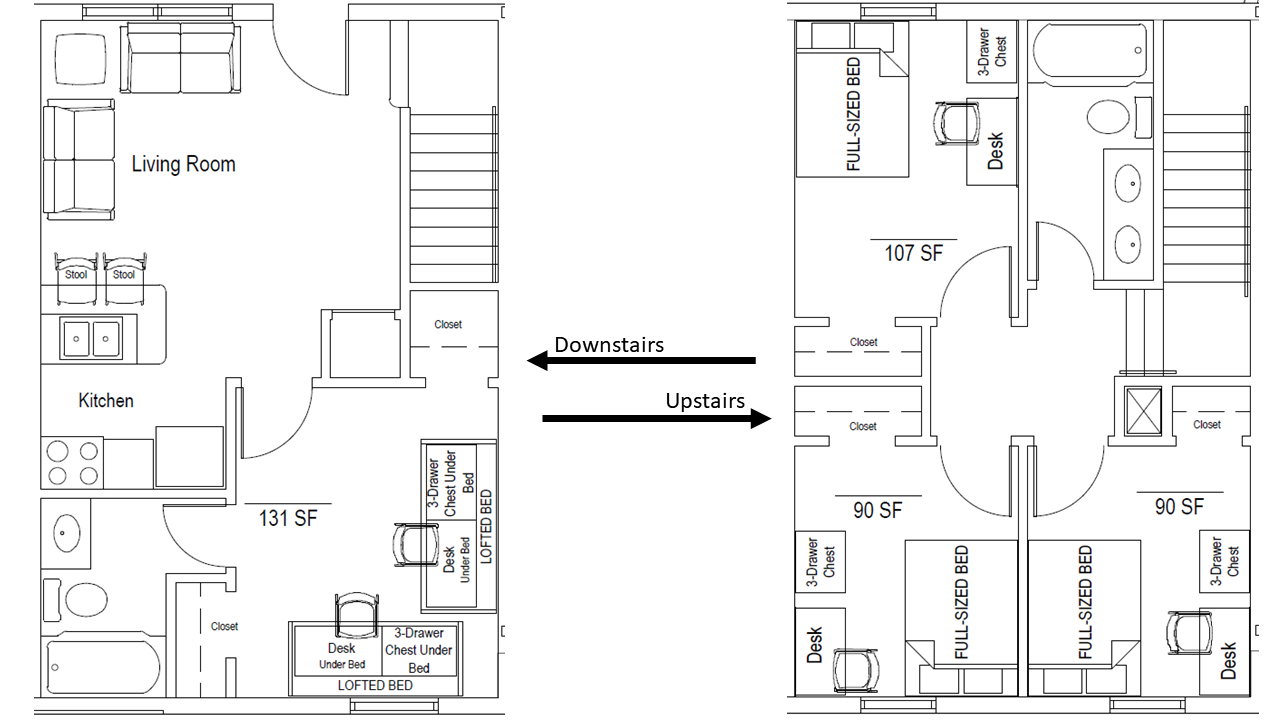 - Four-bedroom townhouse apartment (1 double-occupancy bedroom, 3 private bedrooms, 2 bathrooms): 26 units