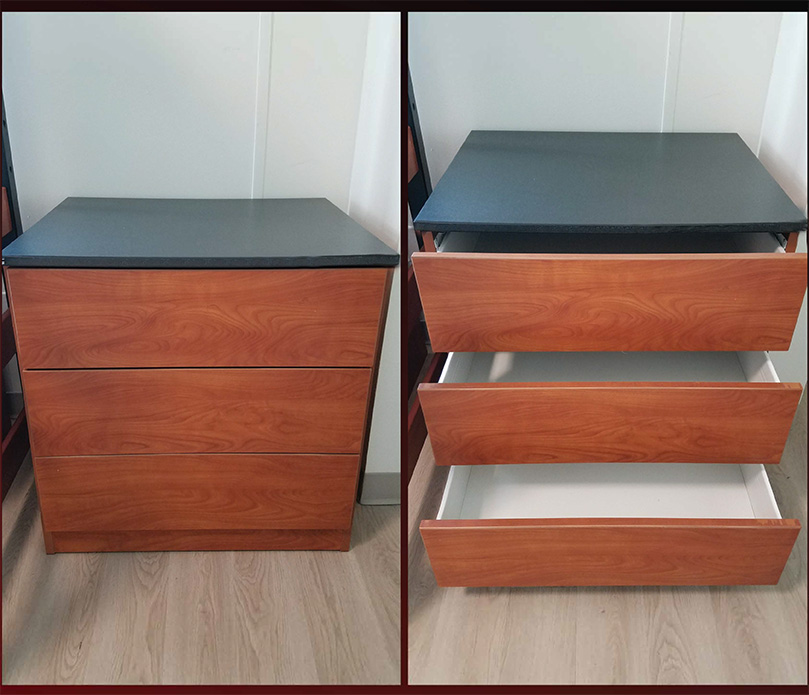 - Chest of drawers: 3-drawers, 30” wide x 24” deep x 30” high