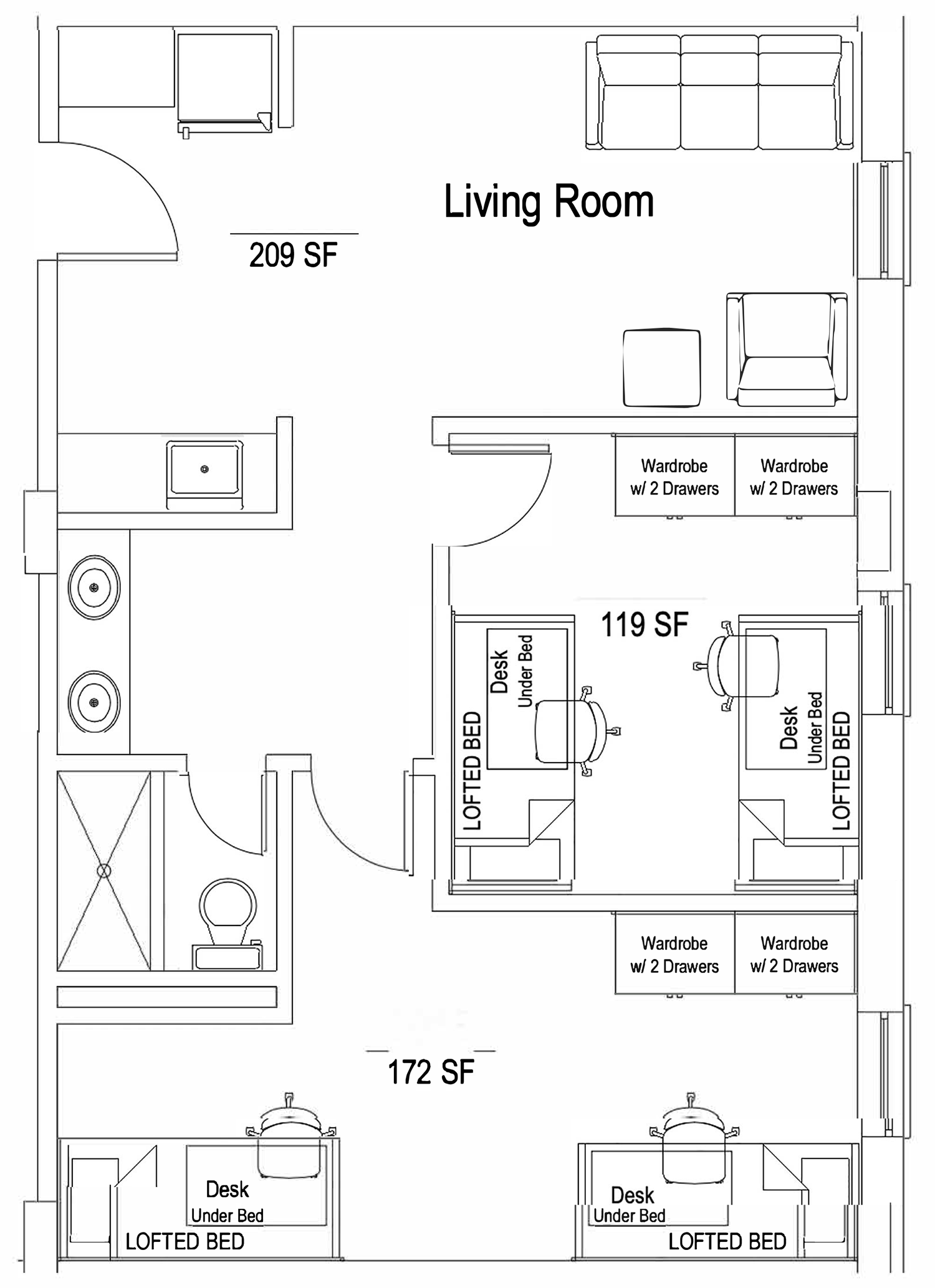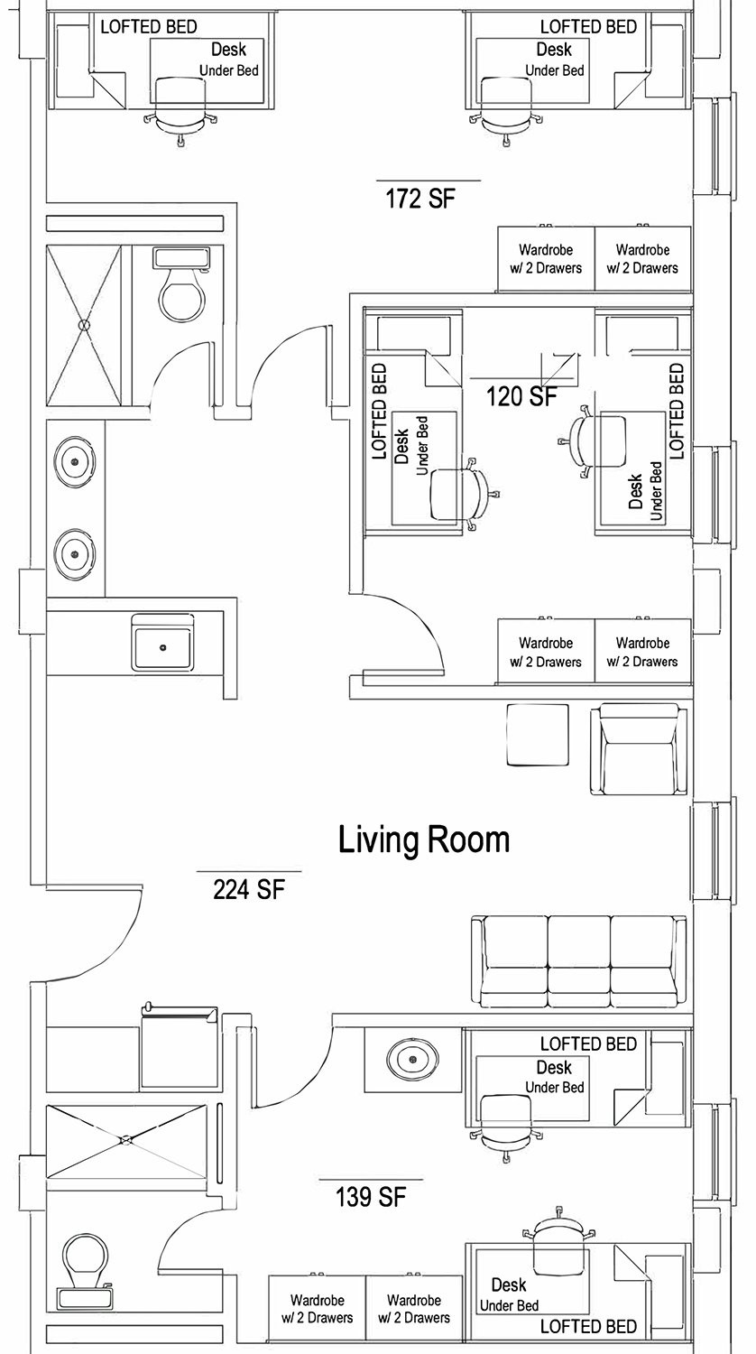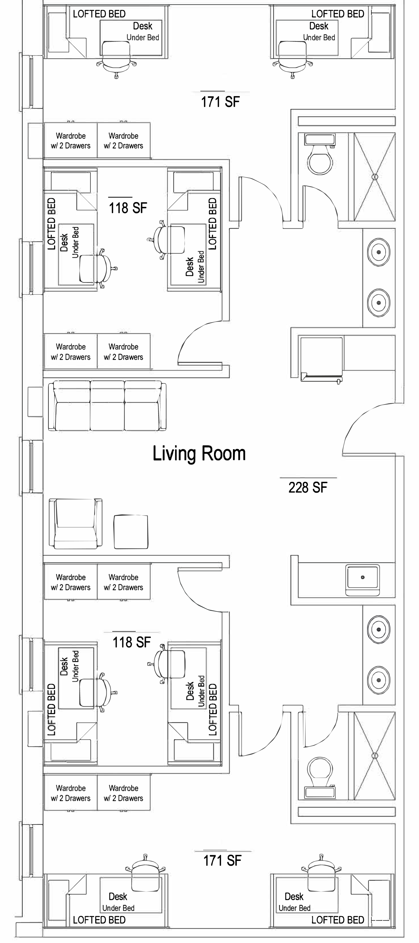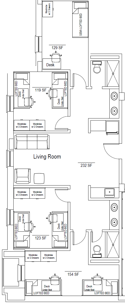 - Four-bedroom suite (4 double-occupancy bedrooms, 2 bathrooms): 16 units