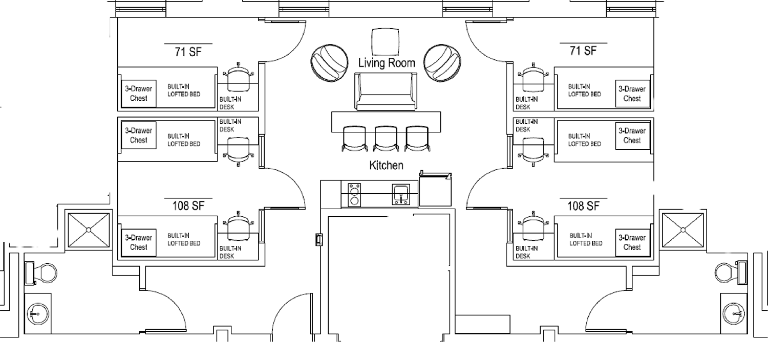- Bedroom dimensions may vary, but a typical double room is 10’-6” W x 10’-9” D. A typical private room is 7’-3” W x 10’-9” D. Rooms feature plank flooring, with approximately 4 feet of space between the beds in a standard double, allowing for a 4’ x 6’ area rug to fit comfortably. Because bedroom doors typically swing outward, a runner rug up to 10 feet can also be accommodated.